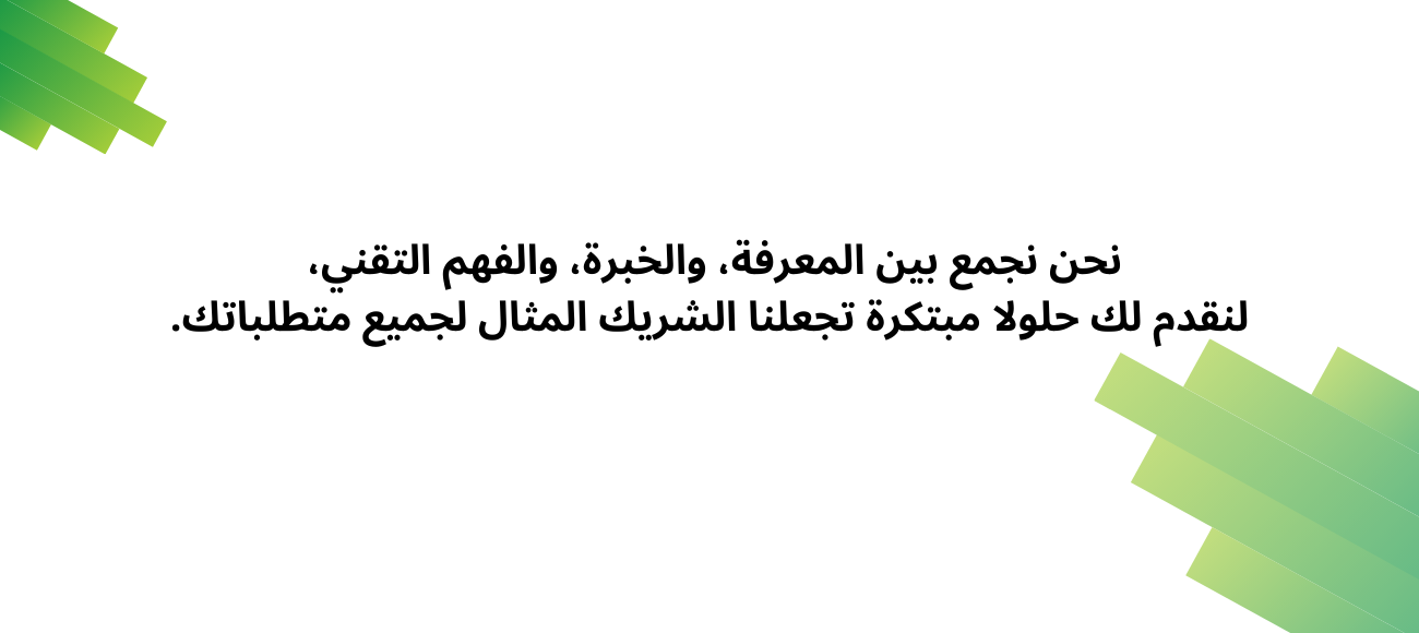 • نعمل باستمرار على تحسين منتجاتنا وخدماتنا لتلبية الاحتياجات الحالية والمستقبلية للمجتمع. الاستدامة أساسية لكيفية قيامنا بأعمالنا. نجمع بين تجربتنا في العديد من المجالات المختلفة ونبني شراكة لتطوير حلول ذات قيمة مضافة.